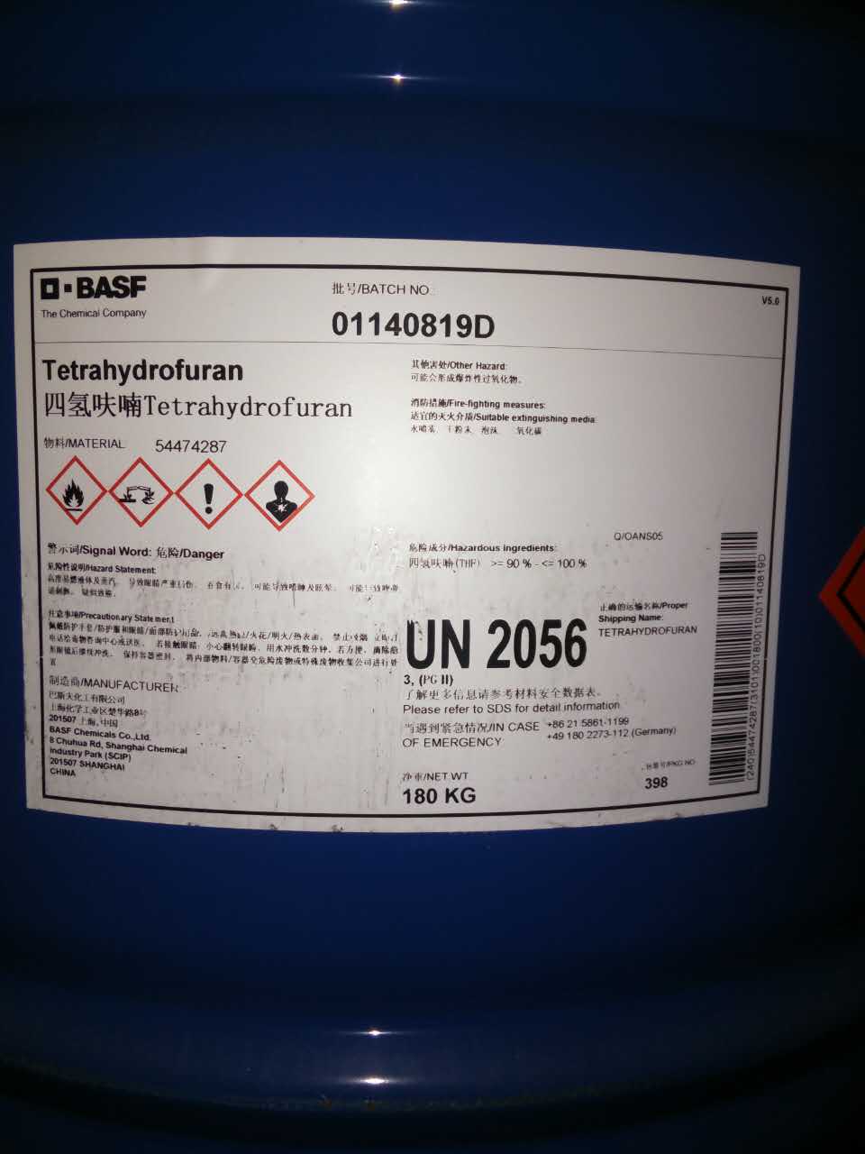 產(chǎn)品名 | 四氫呋喃 | 英文名 | Tetrahydrofuran(THF) | 產(chǎn)品外觀 | 無色透明液體 | 包裝規(guī)格 | 180kg/桶(鐵桶) | 產(chǎn)地 | 上海 | 供應(yīng)商 | 上海巴斯夫 | 應(yīng)用 | 有機合成中常用的溶劑,合成醫(yī)藥的原料 | 危險類別 | 3類; | CAS NO | 109-99-9 |